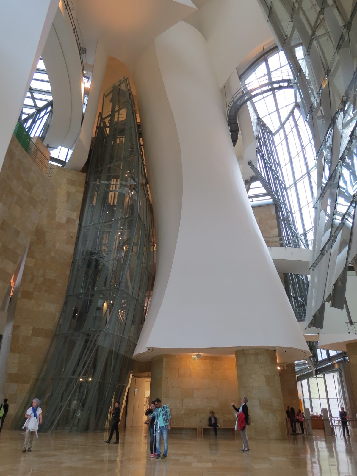” Externamente, o museu é coberto por superfícies de titânio curvadas em vários pontos, que lembram escamas de um peixe, mostrando a influência das formas orgânicas presentes em muitos trabalhos de Gehry. Do átrio central, que tem 50 metros de altura e lembra uma flor cheia de curvas, partem passarelas para os três níveis de galerias. Visto do rio, o edifício parece ter a forma de um barco, homenageando a cidade portuária de Bilbao que teve bons anos de festa marítima”…www.guggenheim.org/bilbao